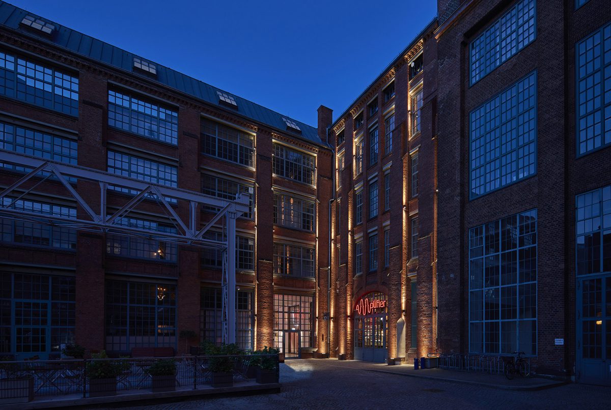 Für den Event- und Coworking-Space Amplifier auf einem denkmalgeschützen Areal wünschte sich der Kunde eine Fassadenbeleuchtung mit Fernwirkung. Die Aussenbeleuchtung macht die historische Klinkerfassade im Dunkeln erlebbar und lenkt die Besucher über den großen Hof zum Ort des Geschehens. Das Projekt hat Rosenspiess – Design von Licht vom Konzept über die Ausführungsplanung bis zur Realisierung in enger Abstimmung mit dem Denkmalschutz betreut.