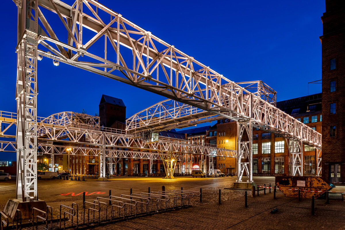 Die GSG Berlin betreibt auf dem denkmalgeschützten ehemaligen AEG Areal in Berlin Wedding den GSG-Hof Gewerbe- & Technologiepark. In unmittelbarer Nachbarschaft zu der 1911/12 von Peter Behrens gebauten Montagehalle für Großmaschinen steht die um 1910 erbaute Kranbahn, die zur Be- und Entladung von Eisenbahnwagen errichtet wurde. Da die Kranbahn bei Dunkelheit kaum wahrnehmbar war, sollte hier durch ein Konzept ein besonderer Ort geschaffen werden, der mit der Lichtgestaltung die bestehende Industriestruktur rücksichtsvoll hervorhebt und gleichzeitig eine zeitgeistige Nacht-Anmutung für ein modernes und attraktives Arbeitsumfeld sowie Events bereithält, um den ganzen Hof aufzuwerten und im Dunkeln erlebbar zu machen. Auf dem Hof befindet sich auch die Veranstaltungs- und Coworking-Location „Amplifier“, die man mit einem Wegeleitsystem und der Inszenierung bei Dunkelheit noch attraktiver machen wollte.